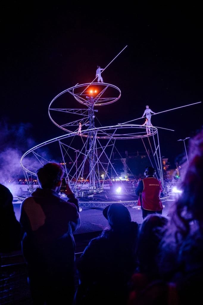 Juste avant la nuit, une volute de métal s’élève vers le ciel. Quatre funambules se lancent tour à tour sur cette courbe dont on a le sentiment qu’elle pourrait se déployer à l’infini. Tel le ruban de Möbius, leur défi à la gravité amène comme une suspension du temps. Un temps perdu entre la pesanteur et la légèreté. L’installation en mouvement devient à la fois une prouesse circassienne et un défi philosophique posé à toutes et tous. Quel choix nous reste-t-il entre la pesanteur ou la légèreté ?